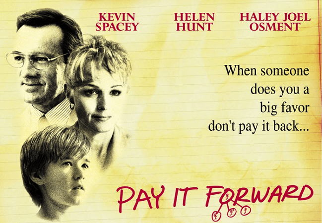 ストーリーはある少年が学校の授業で「世界を変えるには何をすればいいか」という課題に対して「Pay it forward」といって自分が受けた恩を自分の周りの3人に渡すことで、世界を変えようとするというものです。